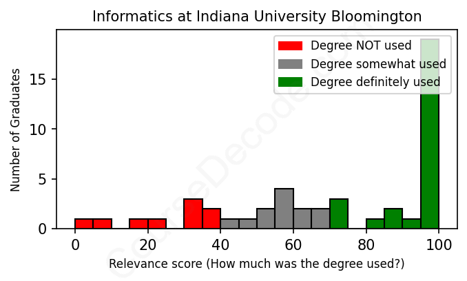 The verdict? Slightly above average. Overall, with an average relevance score of 71%, Informatics graduates from Indiana University Bloomington have a slightly higher likelihood (+4%) of finding work in this field compared to the average graduate across all fields: