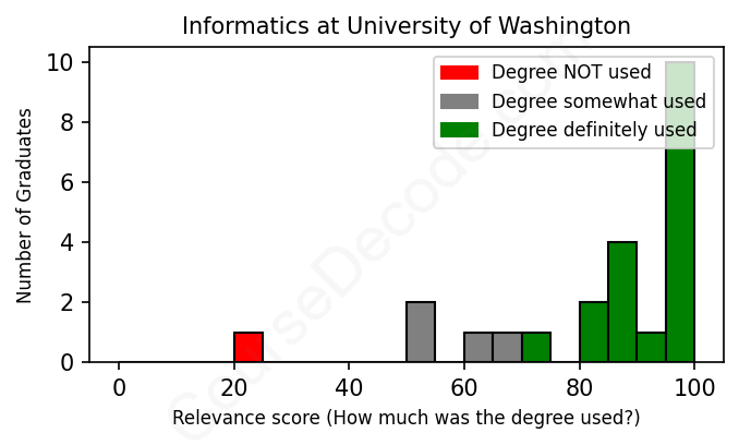 The verdict? Significantly above average. Overall, with an average relevance score of 83%, Informatics graduates from University of Washington have a much higher likelihood (+16%) of finding work in this field compared to the average graduate across all fields: