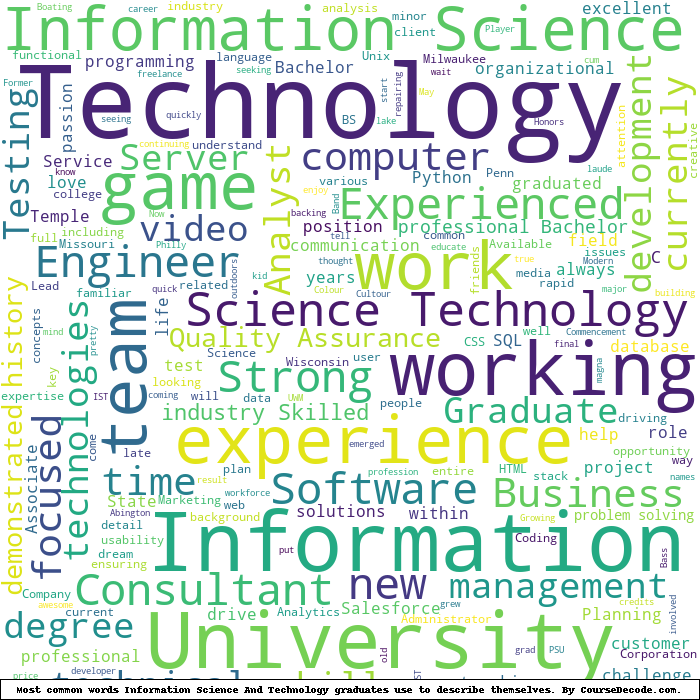 Here is a visual representation of the most common words seen in the "about" section of LinkedIn profiles who have a Bachelor degree in Information Science And Technology (this is across all Information Science And Technology graduates we've analyzed, not just those who went to University of Wisconsin-Milwaukee). This may or may not be useful: