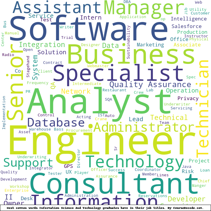 Here is a visual representation of the most common words in job titles for Information Science And Technology graduates (this is across all Information Science And Technology graduates we've analyzed, not just those who went to University of Wisconsin-Milwaukee):
