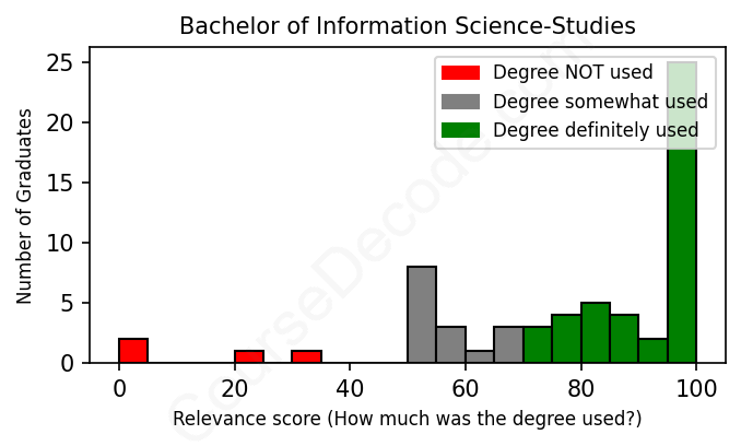 The verdict? Significantly above average. Overall, with an average relevance score of 78%, Information Science-Studies graduates have a much higher likelihood (+11%) of finding work in this field compared to the average graduate across all fields:
