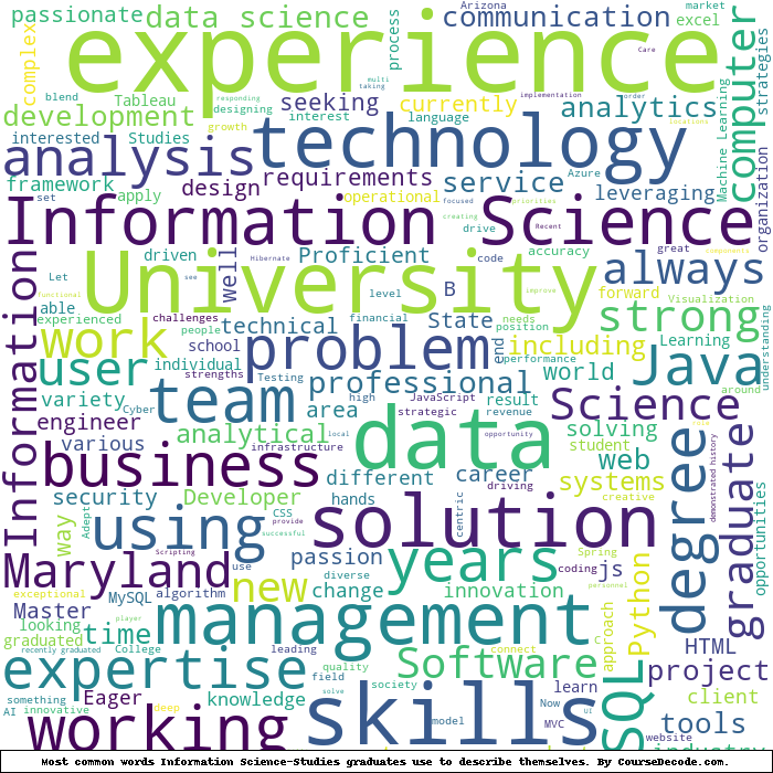 Here is a visual representation of the most common words seen in the "about" section of LinkedIn profiles who have a Bachelor degree in Information Science-Studies. This may or may not be useful: