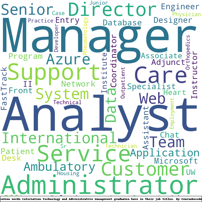 Here is a visual representation of the most common words in job titles for Information Technology and Administrative Management graduates (this is across all Information Technology and Administrative Management graduates we've analyzed, not just those who went to Central Washington University):