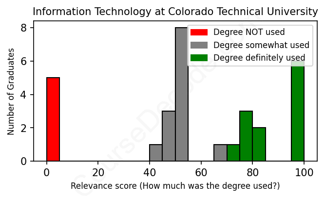 The verdict? Below average. Overall, with an average relevance score of 57%, Information Technology graduates from Colorado Technical University have a lower likelihood (-10%) of finding work in this field compared to the average graduate across all fields: