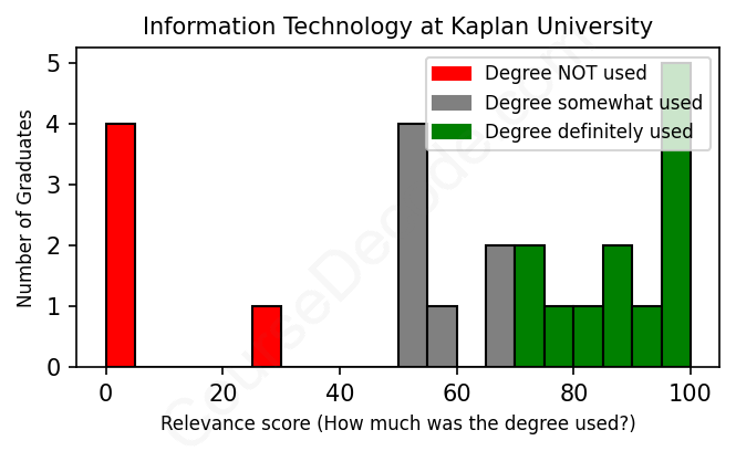 The verdict? Below average. Overall, with an average relevance score of 61%, Information Technology graduates from Kaplan University have a lower likelihood (-6%) of finding work in this field compared to the average graduate across all fields: