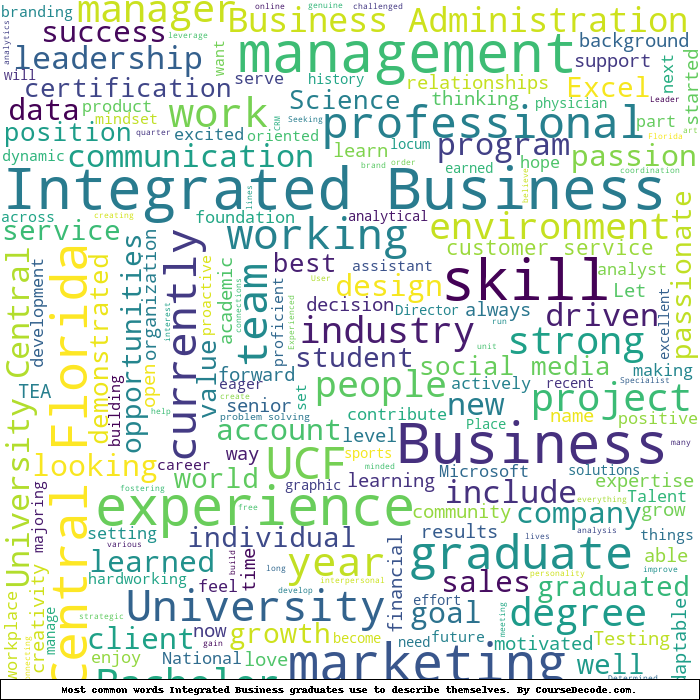 Here is a visual representation of the most common words seen in the "about" section of LinkedIn profiles who have a Bachelor degree in Integrated Business (this is across all Integrated Business graduates we've analyzed, not just those who went to University of Central Florida). This may or may not be useful: