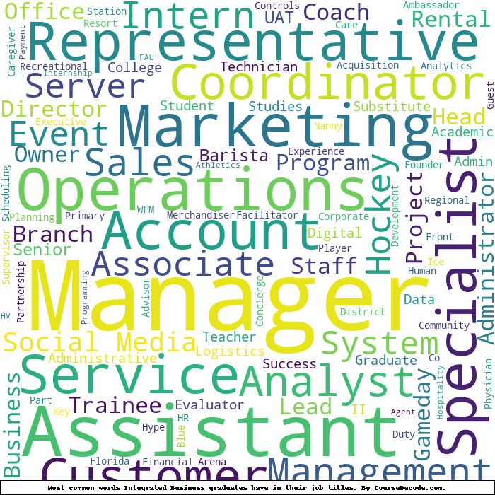Here is a visual representation of the most common words in job titles for Integrated Business graduates (this is across all Integrated Business graduates we've analyzed, not just those who went to University of Central Florida):