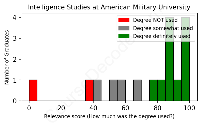 The verdict? Above average. Overall, with an average relevance score of 73%, Intelligence Studies graduates from American Military University have a higher likelihood (+6%) of finding work in this field compared to the average graduate across all fields: