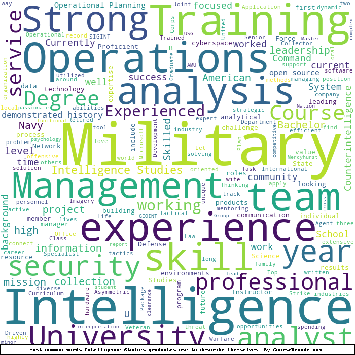 Here is a visual representation of the most common words seen in the "about" section of LinkedIn profiles who have a Bachelor degree in Intelligence Studies (this is across all Intelligence Studies graduates we've analyzed, not just those who went to American Military University). This may or may not be useful: