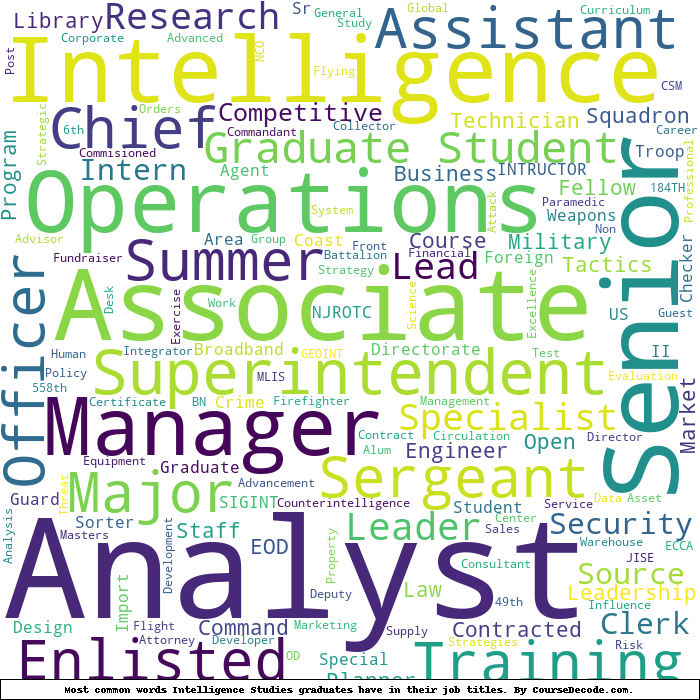 Here is a visual representation of the most common words in job titles for Intelligence Studies graduates (this is across all Intelligence Studies graduates we've analyzed, not just those who went to American Military University):