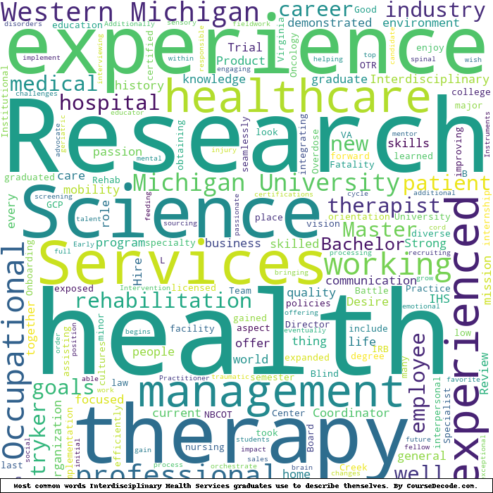 Here is a visual representation of the most common words seen in the "about" section of LinkedIn profiles who have a Bachelor degree in Interdisciplinary Health Services (this is across all Interdisciplinary Health Services graduates we've analyzed, not just those who went to Western Michigan University). This may or may not be useful: