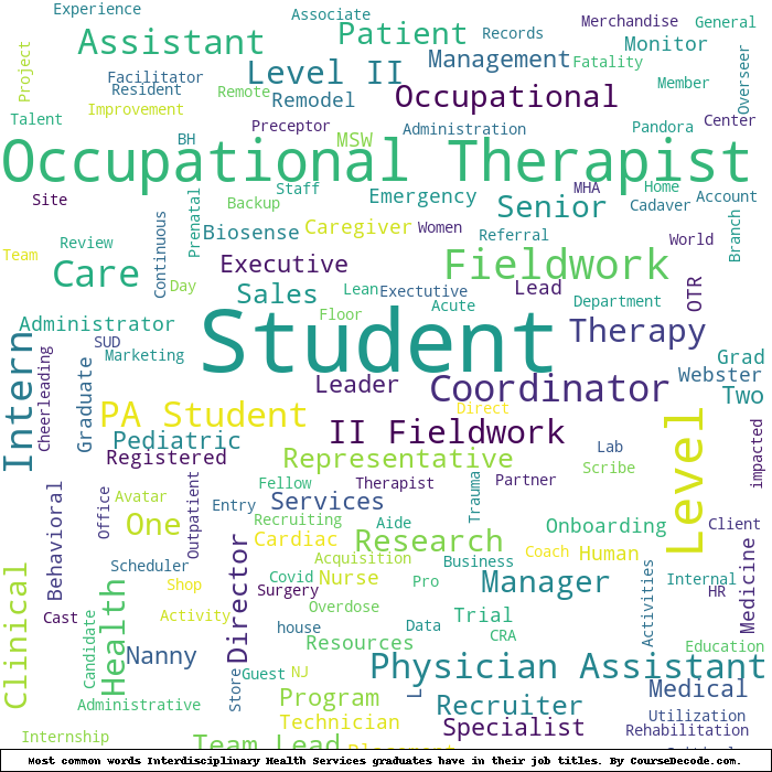 Here is a visual representation of the most common words in job titles for Interdisciplinary Health Services graduates (this is across all Interdisciplinary Health Services graduates we've analyzed, not just those who went to Western Michigan University):