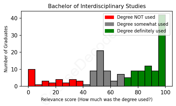 Also, after graduating, only 30% of these graduates have pursued further education other than another Bachelor's degree (such as a Masters degree or other), compared to the average across all profiles of 35%. This suggests a Bachelors degree is enough for most Interdisciplinary Studies graduates, and it's normal to look for work straight after graduation.