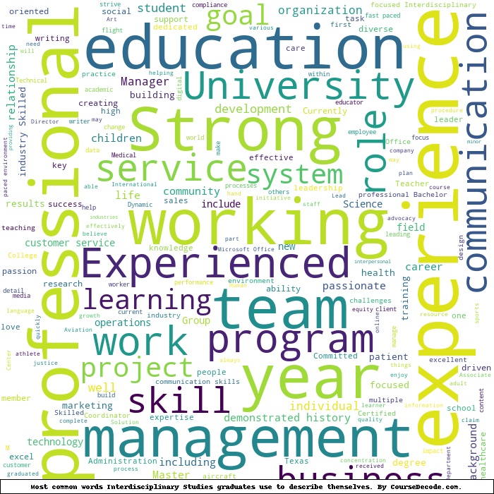 Here is a visual representation of the most common words seen in the "about" section of LinkedIn profiles who have a Bachelor degree in Interdisciplinary Studies. This may or may not be useful: