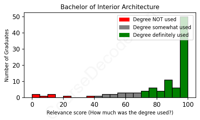 The verdict? Significantly above average. Overall, with an average relevance score of 82%, Interior Architecture graduates have a much higher likelihood (+15%) of finding work in this field compared to the average graduate across all fields: