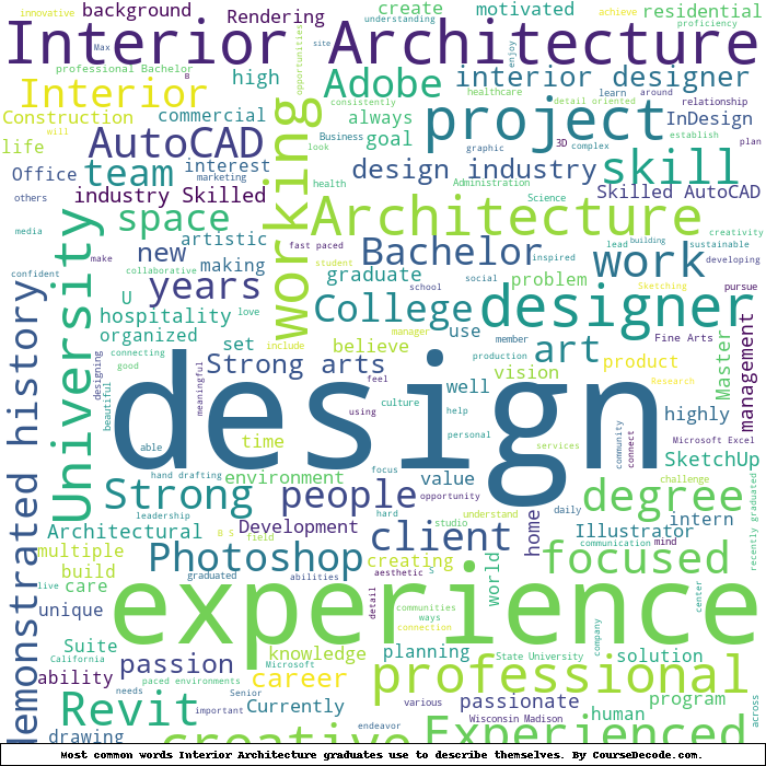 Here is a visual representation of the most common words seen in the "about" section of LinkedIn profiles who have a Bachelor degree in Interior Architecture. This may or may not be useful: