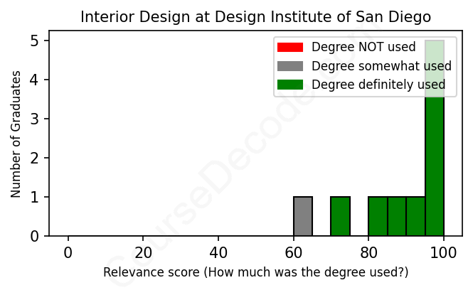 The verdict? Great! Overall, with an average relevance score of 89%, Interior Design graduates from Design Institute of San Diego have a substantially higher likelihood (+22%) of finding work in this field compared to the average graduate across all fields: