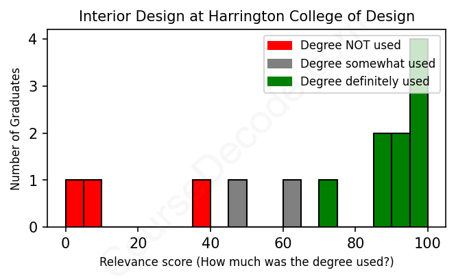 The verdict? Slightly above average. Overall, with an average relevance score of 70%, Interior Design graduates from Harrington College of Design have a slightly higher likelihood (+3%) of finding work in this field compared to the average graduate across all fields: