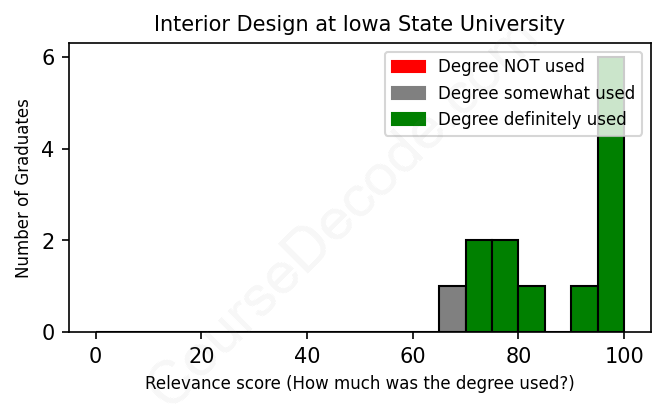 The verdict? Significantly above average. Overall, with an average relevance score of 86%, Interior Design graduates from Iowa State University have a much higher likelihood (+19%) of finding work in this field compared to the average graduate across all fields: