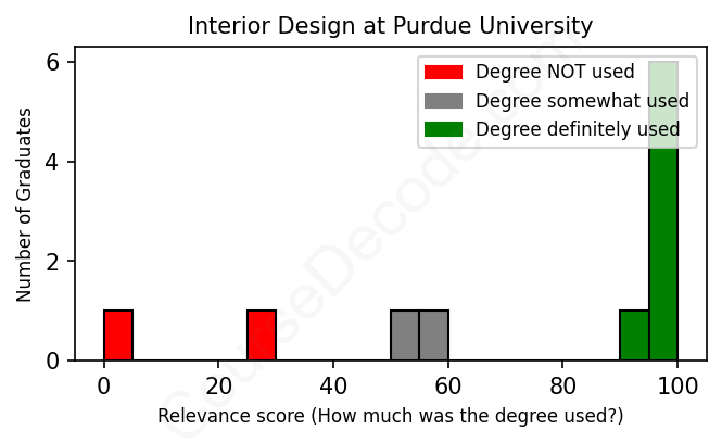 The verdict? Above average. Overall, with an average relevance score of 74%, Interior Design graduates from Purdue University have a higher likelihood (+7%) of finding work in this field compared to the average graduate across all fields: