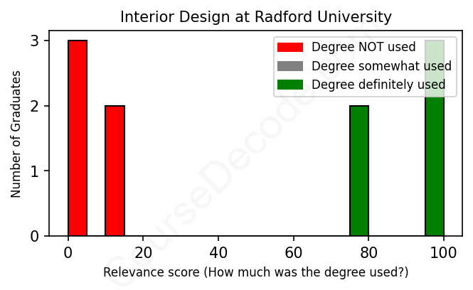 The verdict? Significantly below average. Overall, with an average relevance score of 47%, Interior Design graduates from Radford University have a much lower likelihood (-20%) of finding work in this field compared to the average graduate across all fields: