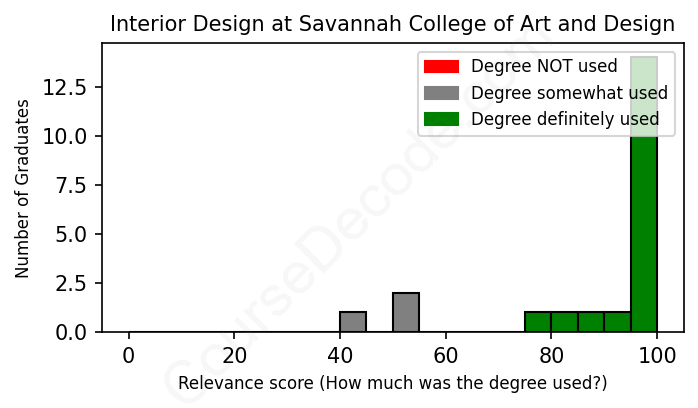The verdict? Great! Overall, with an average relevance score of 89%, Interior Design graduates from Savannah College of Art and Design have a substantially higher likelihood (+22%) of finding work in this field compared to the average graduate across all fields: