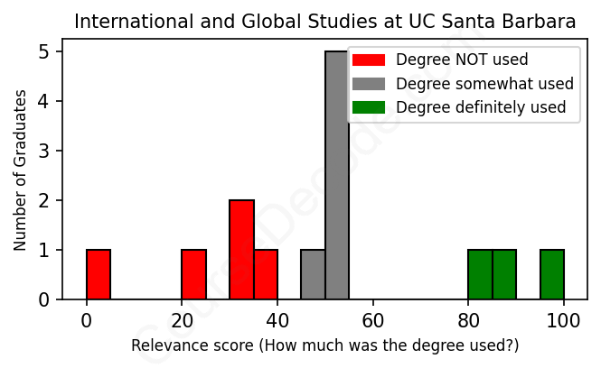 The verdict? Significantly below average. Overall, with an average relevance score of 49%, International and Global Studies graduates from UC Santa Barbara have a much lower likelihood (-18%) of finding work in this field compared to the average graduate across all fields:
