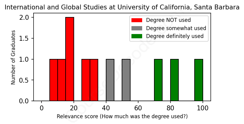 The verdict? Bad. Overall, with an average relevance score of 41%, International and Global Studies graduates from University of California, Santa Barbara have a substantially lower likelihood (-26%) of finding work in this field compared to the average graduate across all fields:
