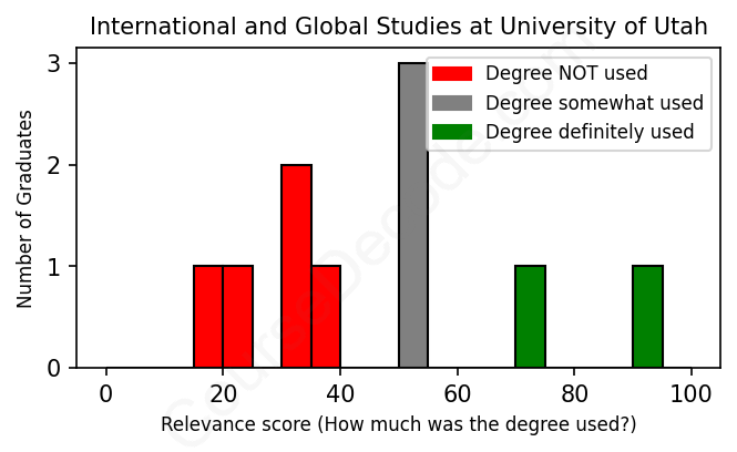 The verdict? Bad. Overall, with an average relevance score of 46%, International and Global Studies graduates from University of Utah have a substantially lower likelihood (-21%) of finding work in this field compared to the average graduate across all fields: