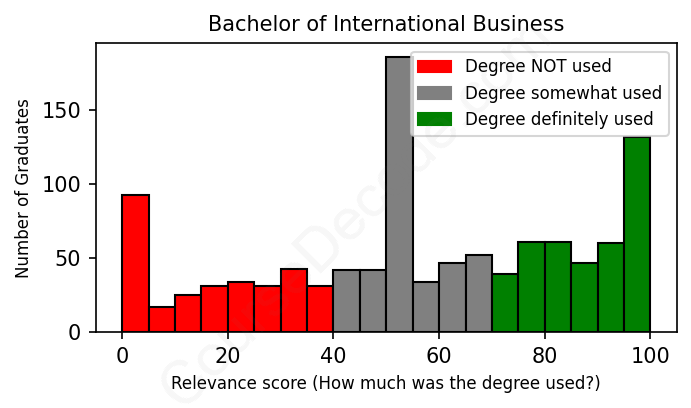 The verdict? Significantly below average. Overall, with an average relevance score of 55%, International Business graduates have a much lower likelihood (-12%) of finding work in this field compared to the average graduate across all fields: