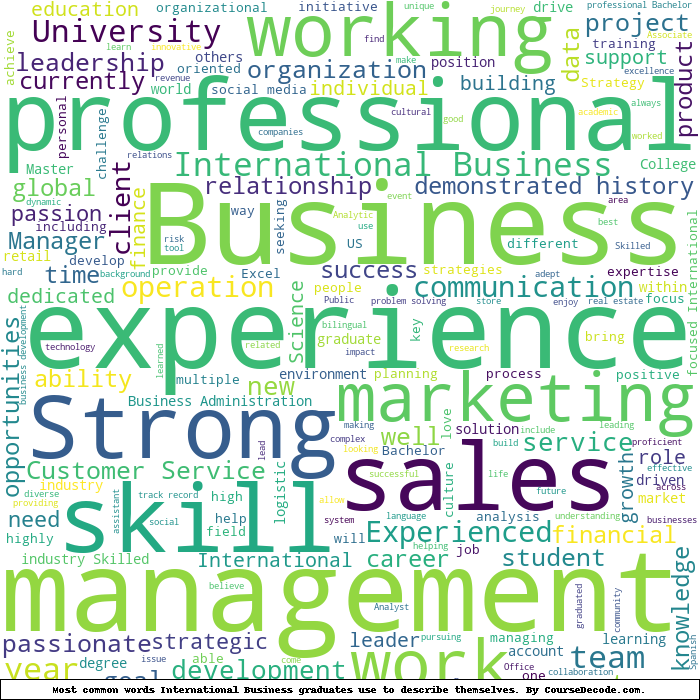 Here is a visual representation of the most common words seen in the "about" section of LinkedIn profiles who have a Bachelor degree in International Business. This may or may not be useful: