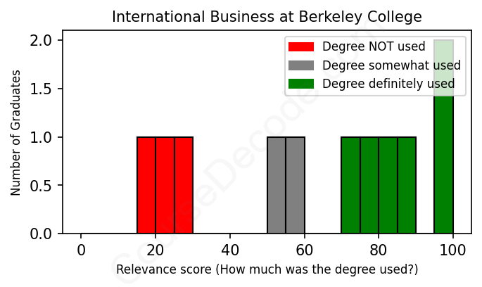 The verdict? Slightly below average. Overall, with an average relevance score of 62%, International Business graduates from Berkeley College have a slightly lower likelihood (-5%) of finding work in this field compared to the average graduate across all fields: