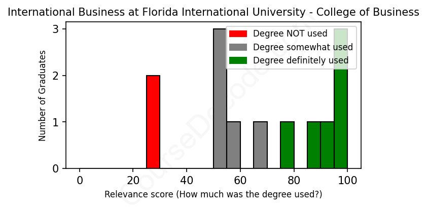 The verdict? On par with the average. Overall, with an average relevance score of 67%, International Business graduates from Florida International University - College of Business have about the same likelihood of finding work in this field as the average graduate across all fields: