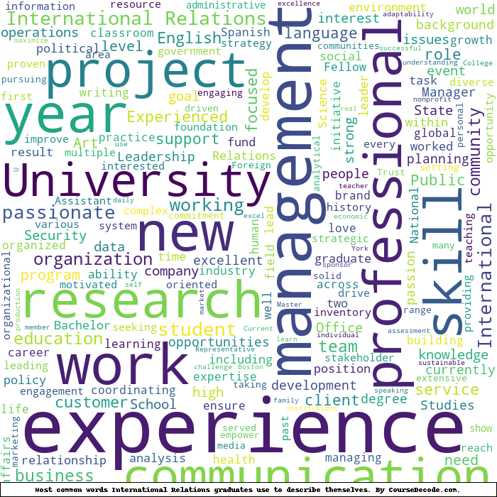 Here is a visual representation of the most common words seen in the "about" section of LinkedIn profiles who have a Bachelor degree in International Relations. This may or may not be useful: