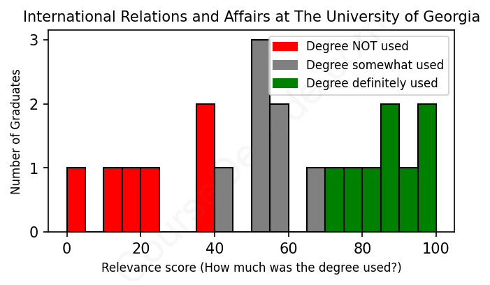 The verdict? Significantly below average. Overall, with an average relevance score of 56%, International Relations and Affairs graduates from The University of Georgia have a much lower likelihood (-11%) of finding work in this field compared to the average graduate across all fields: