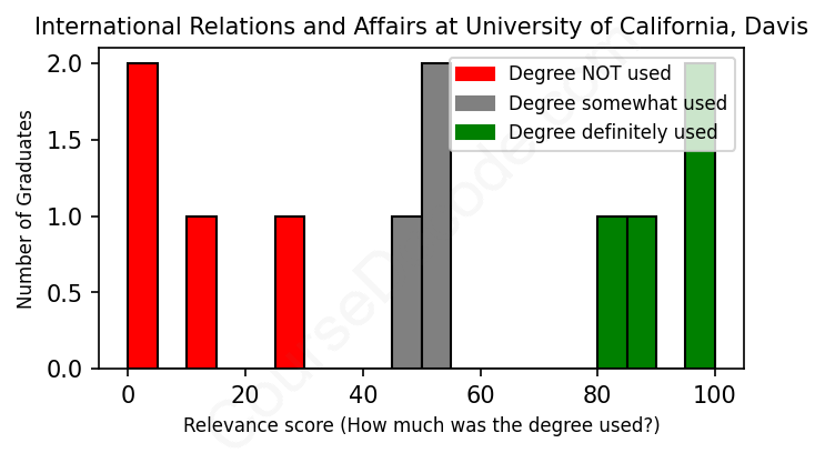 The verdict? Significantly below average. Overall, with an average relevance score of 50%, International Relations and Affairs graduates from University of California, Davis have a much lower likelihood (-17%) of finding work in this field compared to the average graduate across all fields: