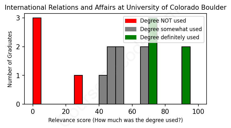 First, some facts. Of the International Relations and Affairs graduates from University of Colorado Boulder we've analyzed , here's how many have used (or NOT used) their degree in their career: