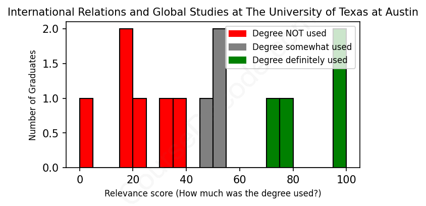 First, some facts. Of the International Relations and Global Studies graduates from The University of Texas at Austin we've analyzed , here's how many have used (or NOT used) their degree in their career: