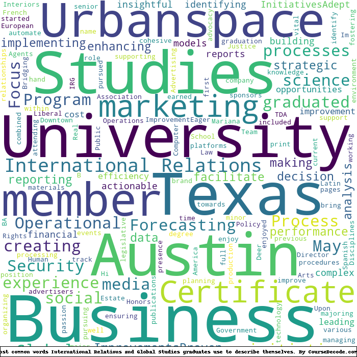 Here is a visual representation of the most common words seen in the "about" section of LinkedIn profiles who have a Bachelor degree in International Relations and Global Studies (this is across all International Relations and Global Studies graduates we've analyzed, not just those who went to The University of Texas at Austin). This may or may not be useful: