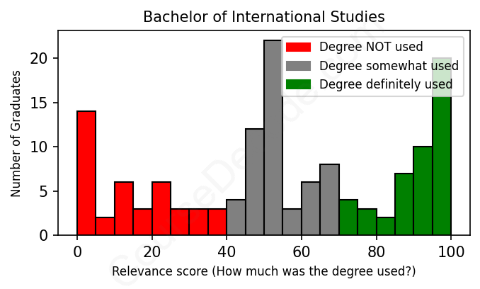 The verdict? Significantly below average. Overall, with an average relevance score of 54%, International Studies graduates have a much lower likelihood (-13%) of finding work in this field compared to the average graduate across all fields: