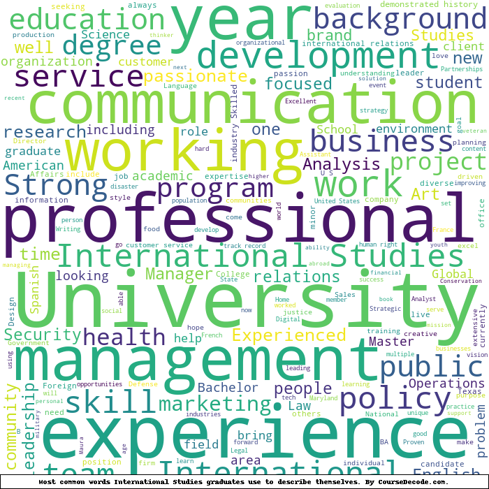 Here is a visual representation of the most common words seen in the "about" section of LinkedIn profiles who have a Bachelor degree in International Studies. This may or may not be useful: