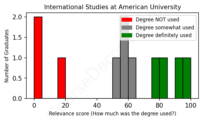 The verdict? Significantly below average. Overall, with an average relevance score of 54%, International Studies graduates from American University have a much lower likelihood (-13%) of finding work in this field compared to the average graduate across all fields: