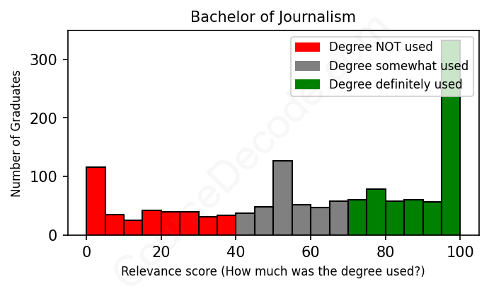 The verdict? Below average. Overall, with an average relevance score of 61%, Journalism graduates have a lower likelihood (-6%) of finding work in this field compared to the average graduate across all fields: