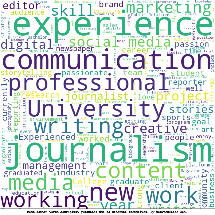 Here is a visual representation of the most common words seen in the "about" section of LinkedIn profiles who have a Bachelor degree in Journalism. This may or may not be useful: