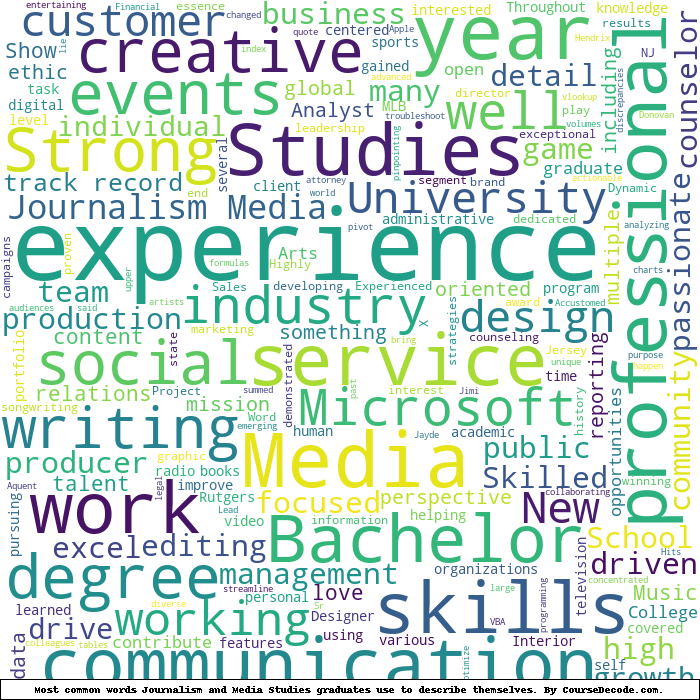 Here is a visual representation of the most common words seen in the "about" section of LinkedIn profiles who have a Bachelor degree in Journalism and Media Studies (this is across all Journalism and Media Studies graduates we've analyzed, not just those who went to Rutgers, The State University of New Jersey-New Brunswick). This may or may not be useful: