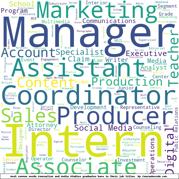Here is a visual representation of the most common words in job titles for Journalism and Media Studies graduates (this is across all Journalism and Media Studies graduates we've analyzed, not just those who went to Rutgers, The State University of New Jersey-New Brunswick):