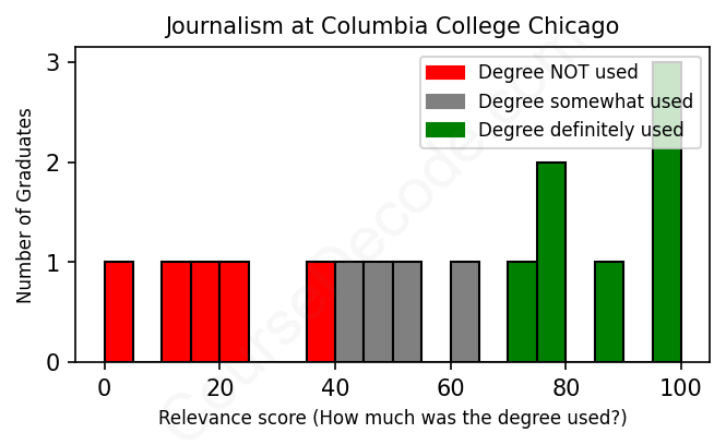 The verdict? Significantly below average. Overall, with an average relevance score of 56%, Journalism graduates from Columbia College Chicago have a much lower likelihood (-11%) of finding work in this field compared to the average graduate across all fields: