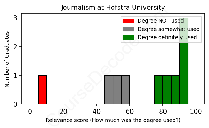 The verdict? Slightly above average. Overall, with an average relevance score of 68%, Journalism graduates from Hofstra University have a slightly higher likelihood (+1%) of finding work in this field compared to the average graduate across all fields: