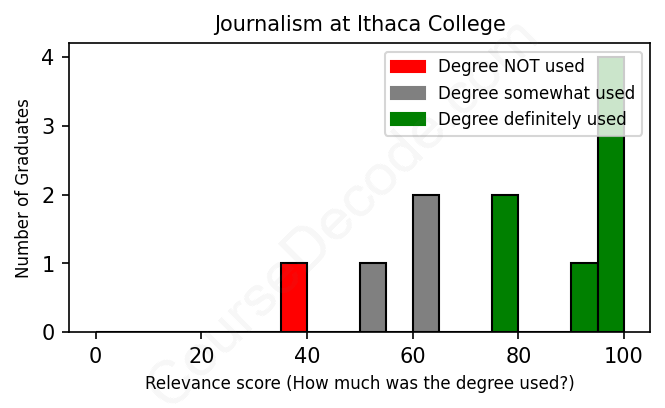 The verdict? Above average. Overall, with an average relevance score of 77%, Journalism graduates from Ithaca College have a higher likelihood (+10%) of finding work in this field compared to the average graduate across all fields: