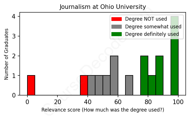 The verdict? Slightly above average. Overall, with an average relevance score of 68%, Journalism graduates from Ohio University have a slightly higher likelihood (+1%) of finding work in this field compared to the average graduate across all fields: